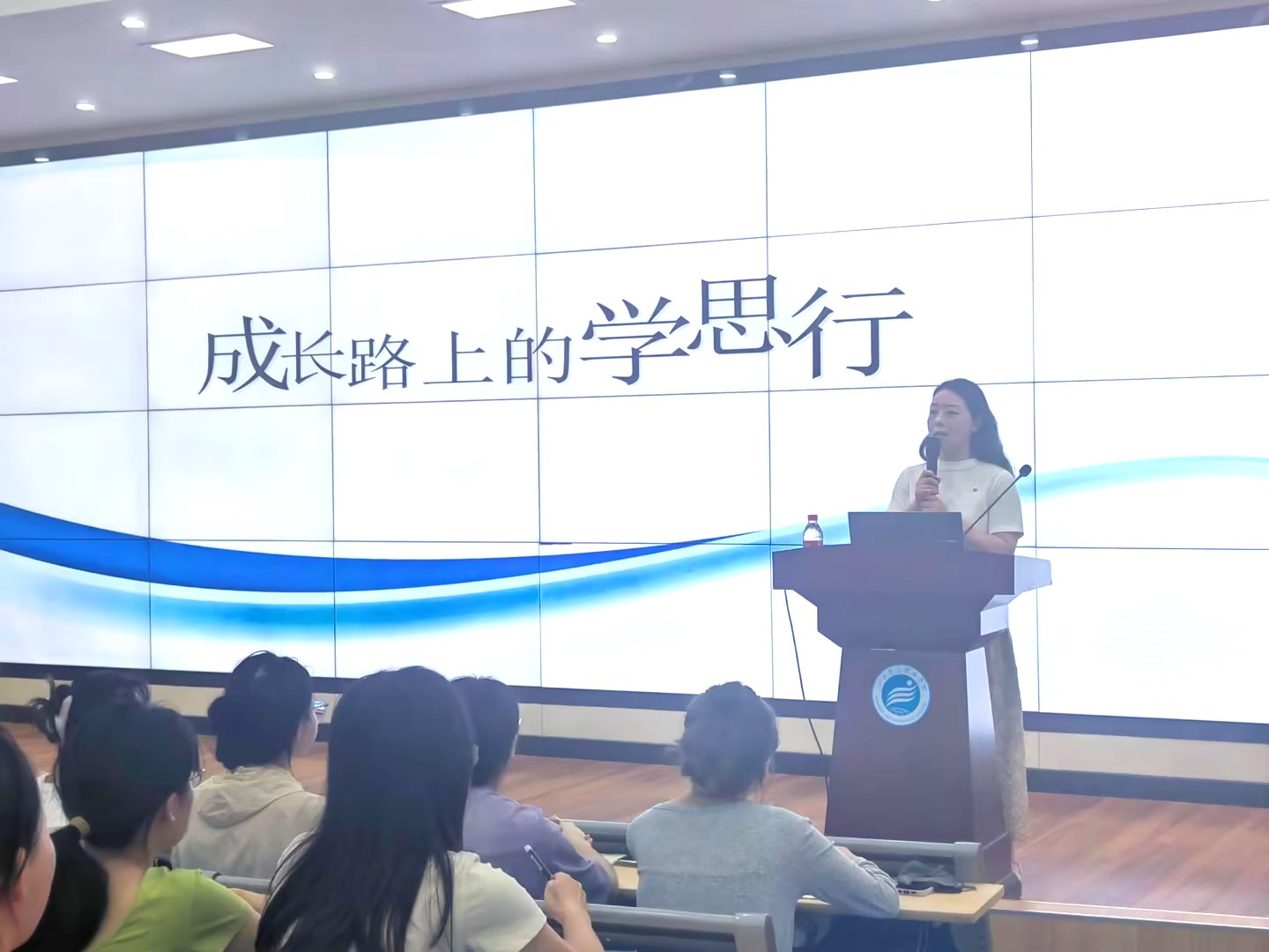 万莉以“体悟二十大精神 倾情幼教事业”为主题,结合自己成长路上的所学所思,为大家带来了一场别开生面的经验分享。她畅谈自己30年来从事幼教领域的心路历程,更将对事业的热爱与执着传递给了现场的每一个人。现场座无虚席,她的精彩讲述激发了同学们对未来职业发展的热情与信心。