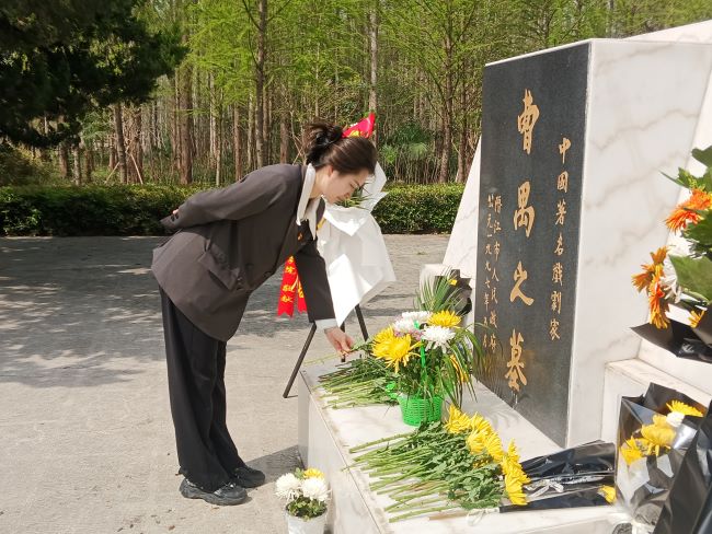 在庄严肃穆的烈士陵园,全体党员整齐列队,向纪念碑敬献花篮,集体默哀后清理墓区。在曹禺陵园,党员们瞻仰名人雕像,现场交流学习,感悟文化工作者的家国情怀。步入曹禺纪念馆、曹禺祖居博物馆,通过志愿者的讲解,学习曹禺先生“戏如人生 家国为魂”的艺术情怀。“一个民族的文化,必须扎根于自己的土地。”学生党员陈家宝在交流中感慨。