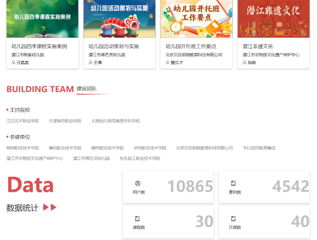 该资源库由江汉艺术职业学院牵头,联合天津城市职业学院、太原幼儿师范高等专科学校等10所高职高专院校、3家企业共同建设。按照“系统化设计、结构化课程、颗粒化资源”的设计逻辑,围绕幼儿技能国赛经验分享、童创儿童戏剧、地方传统文化传承和幼儿教师职业成长系列等4项特色内容,该资源库将被打造成“满足自主学习、教学成果推广、赋能社会服务”的智慧化学习平台