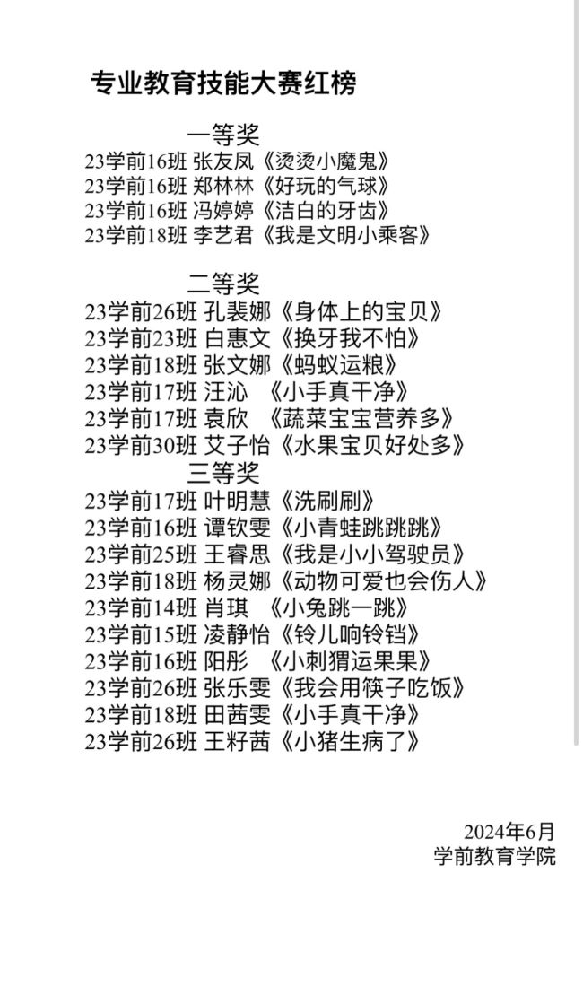 (通讯员 李鑫鹤)近日,学前教育学2023-2024下学年学前教育专业教育技能大赛落下帷幕。23学前16班张友凤等4位同学荣获一等奖,23学前26班孔裴娜等6位同学荣获二等奖,23学前27班叶明慧等10位同学荣获三等奖。
