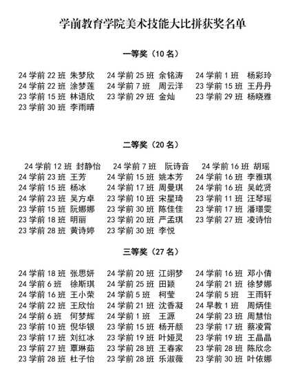 (通讯员 方来东)日前,学前教育学院美术教研室举办美术技能比赛,24学前22班朱梦欣等10名同学荣获一等奖。