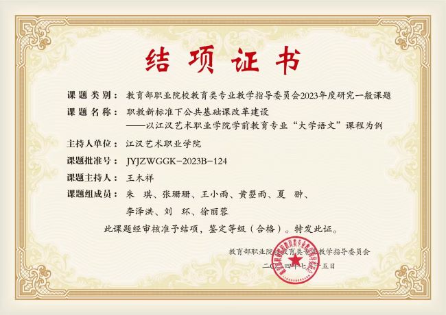 近日,由学前教育学院教师主持的3项课题顺利通过结项验收。其中包括王木祥老师主持的国家级课题《职教新标准下公共基础课改革建设》、市级课题《曹禺戏剧的诗化倾向和民族性研究》和柯文平老师主持的校级项目《高职学前教育专业儿歌弹唱课程教学模式研究》。