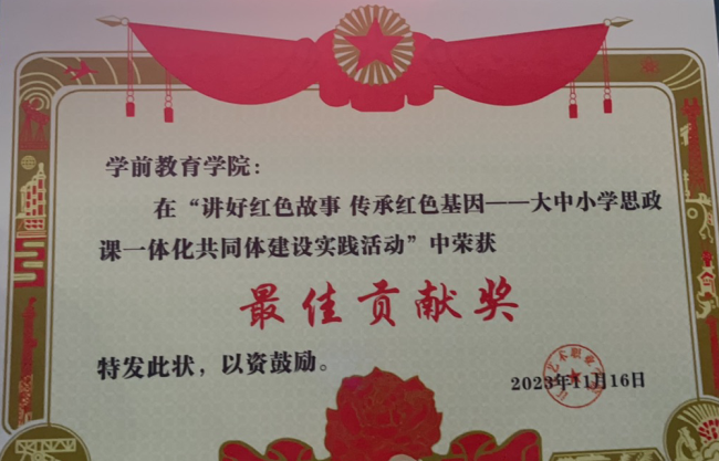 11月16日晚,江汉艺术职业学院“讲好红色故事 传承红色基因——大中小学思政课一体化共同体建设实践活动”在学校大礼堂落下帷幕。学前教育学院学生周璐璐荣获一等奖,卢馨怡、姜靓雪分获二等奖、三等奖,学前教育学院荣获”最佳贡献奖”。