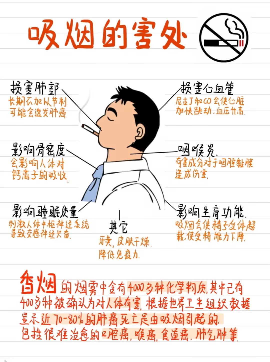 其他危害:吸烟会使牙齿变黄、口腔有异味,增加患牙周病的几率。此外,吸烟还会削弱人体的免疫系统,使人更容易受到疾病的侵袭,并且与多种癌症的发生密切相关,如膀胱癌、胰腺癌、胃癌等。