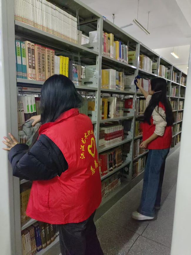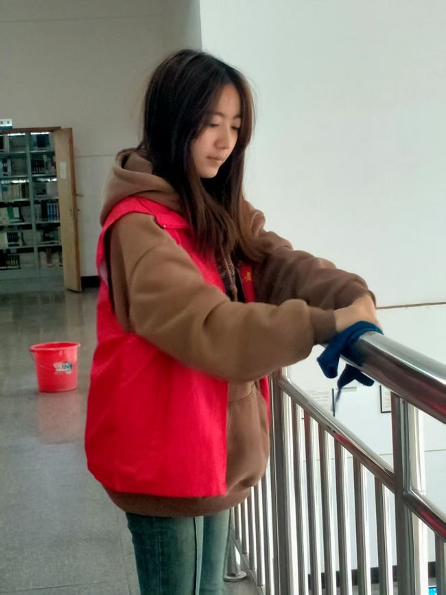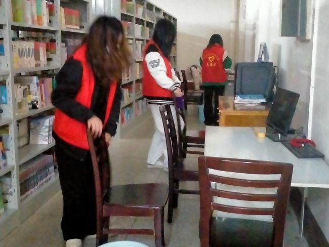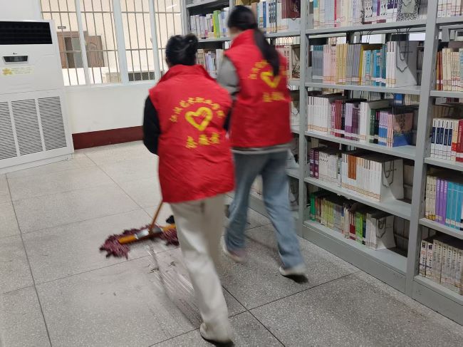 志愿者们分工合作,分别在一楼和二楼图书摆放区域擦书柜、拖地、打扫,让图书馆环境变得更加整洁、干净。