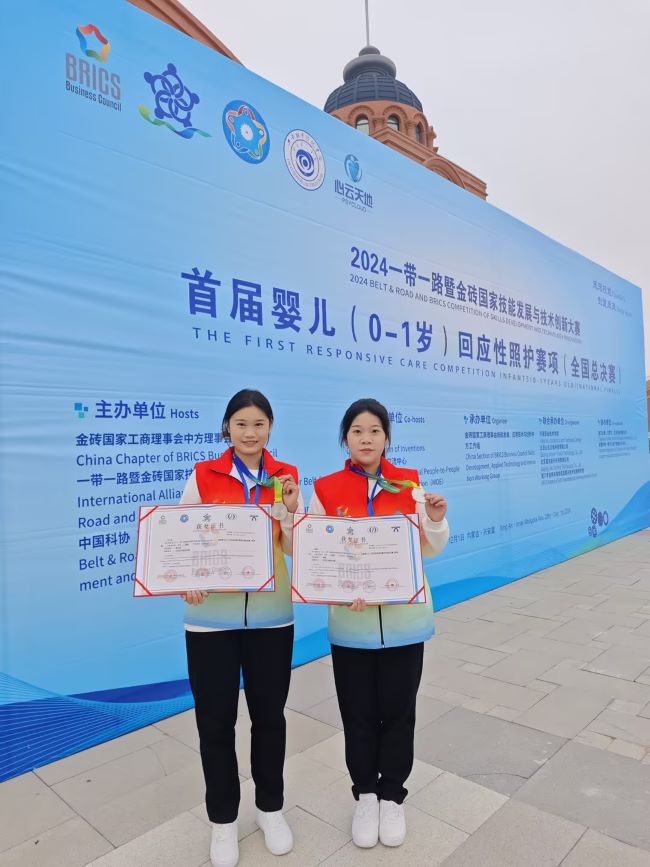 (通讯员李小佳)11月29日,2024“一带一路”暨金砖国家技能发展与技术创新大赛首届婴儿(0-1岁)回应性照护赛项全国总决赛,在内蒙古成功举办。江汉艺术职业学院学前教育学院学生吴莜、于小岚同学均荣获二等奖,教师李小佳、李璐获优秀指导教师奖,江汉艺术职业学院获优秀组织奖。