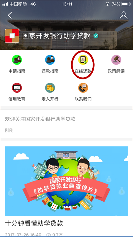 3. 进入国家开发银行助学贷款界面,点击【在线还款】