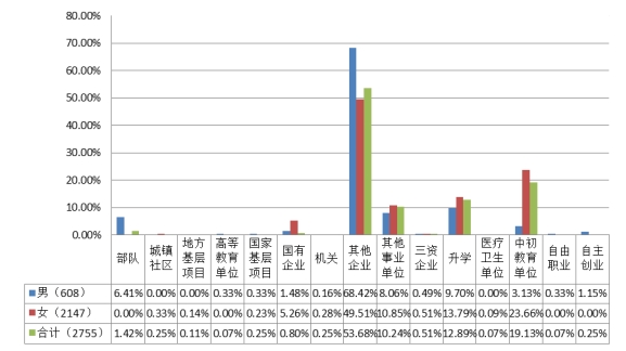 毕业总人数的20.83%;女性毕业生2428人,占毕业总人数的79.17%,男女人数比为1∶3.80 ,具体如下表所示: