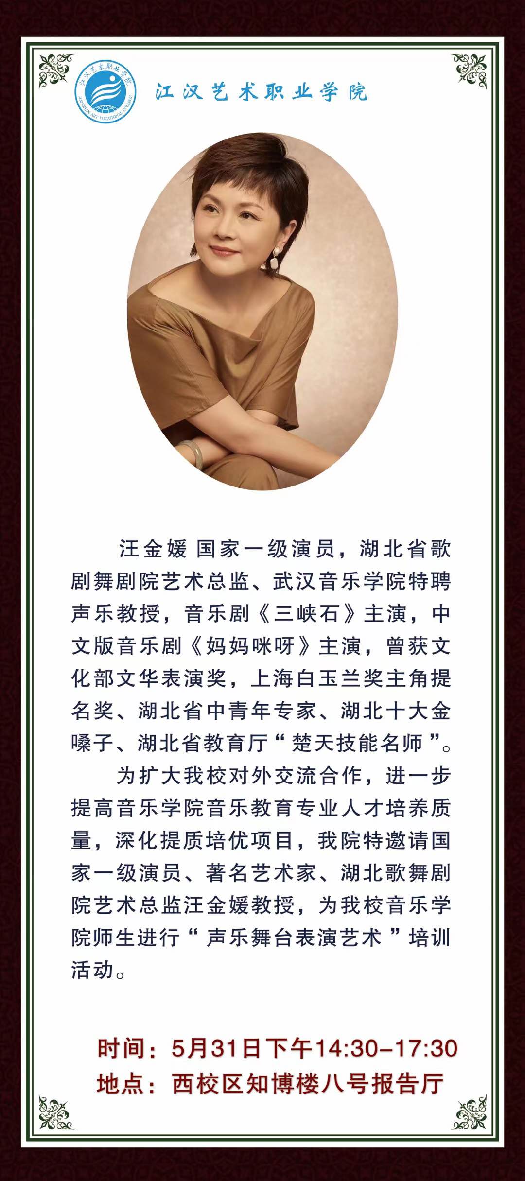 5月31日周二(今天)下午14:30-17:30国家一级演员、湖北省歌舞剧院艺术总监、武汉音乐学院特聘声乐教授 汪金媛老师“声乐舞台表演艺术”培训活动地址:八号报告厅