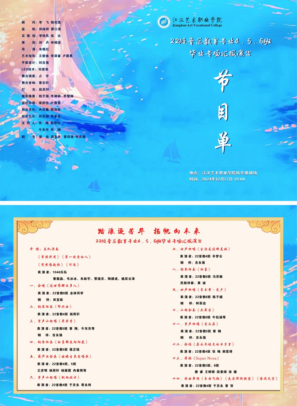2022级音乐教育4、5、6班毕业汇报演出将于2024年12月27日19:00在学院风华楼剧场举行。